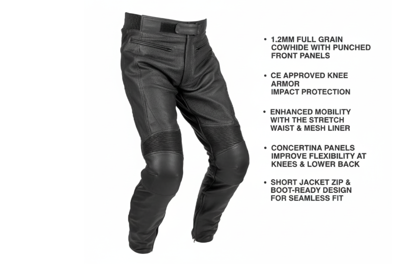 Built for riders who demand protection without sacrificing comfort, these fitted leather motorcycle pants are engineered to keep up with your sport-touring adventures—even in warm weather.